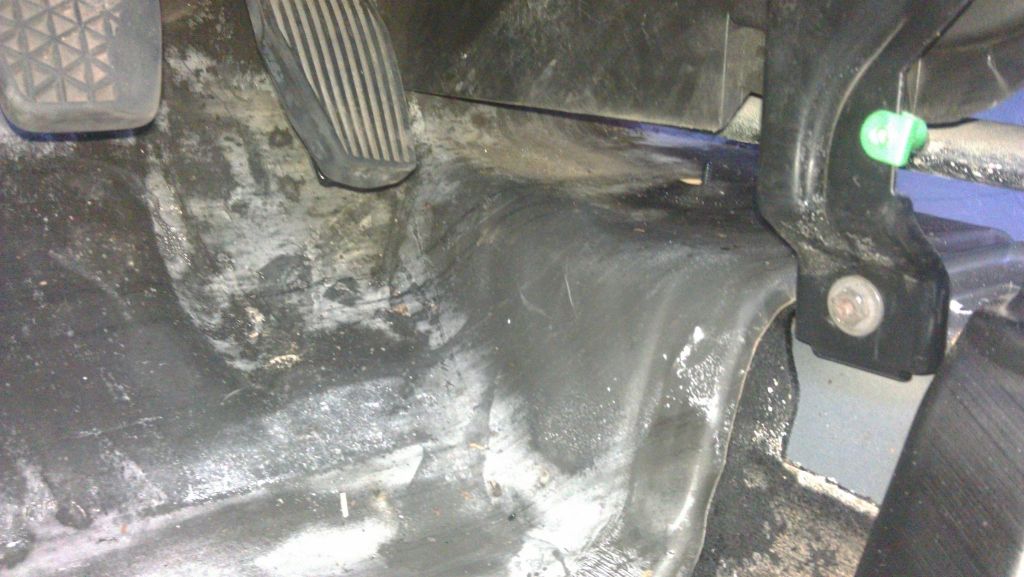 links de bestuurders kant was nat ik doel op dat zachte spul achter de pedalen